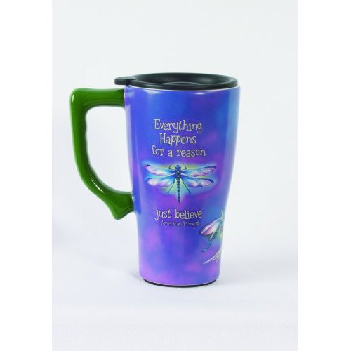 Whether it's with you in your car or on your desk at work, this high quality, inspirational travel mug is a MUST HAVE. Beautiful, practical & convenient; a favorite traveling companion for years to come. The mug reads "Everything Happens for a Reason, Just Believe" on the front, with Dragonflies and Irises on the back. (This sale is for one mug only.) Travel mug holds up to 14 ounces, with a snug plastic lid and two openings for sipping Made of ceramic Lid swivels open and closed to prevent spilling Mug is approximately 6" tall No-slip rubber bottom. Dishwasher and Microwave safe